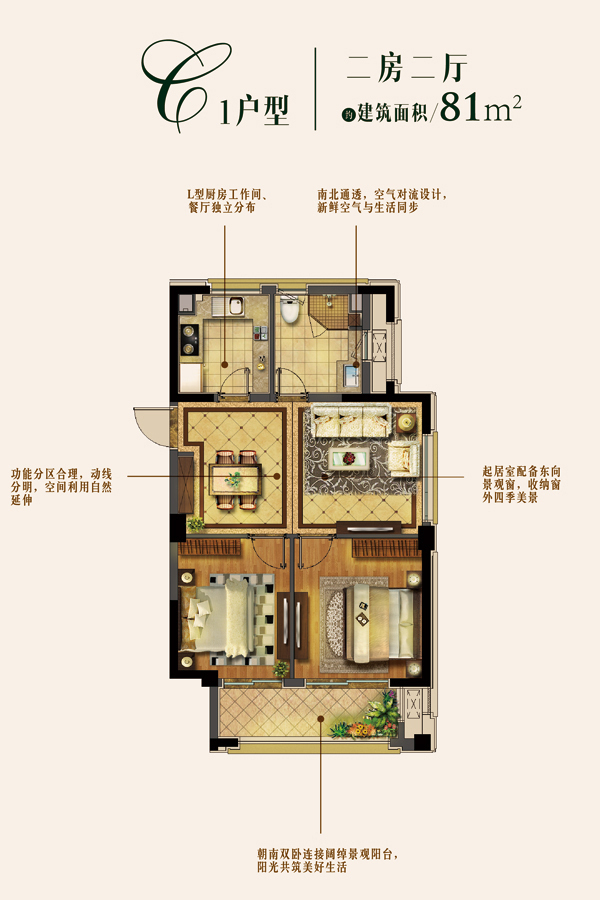 整体户型方正,活动区域开阔,居住舒适度高;全明通透户型,居住舒适度较高,整个空间采光充足,利于后期居住;整体空间布局合理,能够保证动静分离和居室通风,方便使用;卧室厨卫等各个功能区的面积大小都比较合理,居住体验便利。