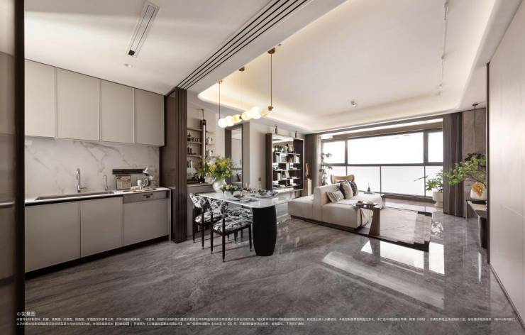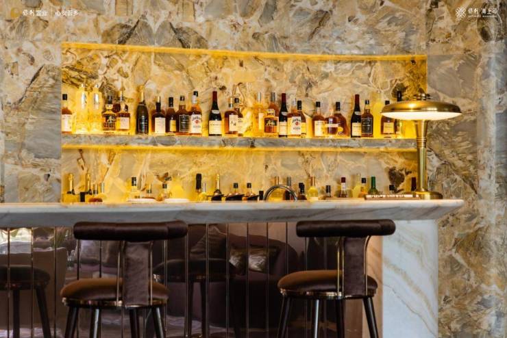 鎏光水吧会客厅,吧台背景采用梵克雅宝奢石,每块纹理独一无二,尽显珠宝陈列美学,可供业主未来会客使用。
