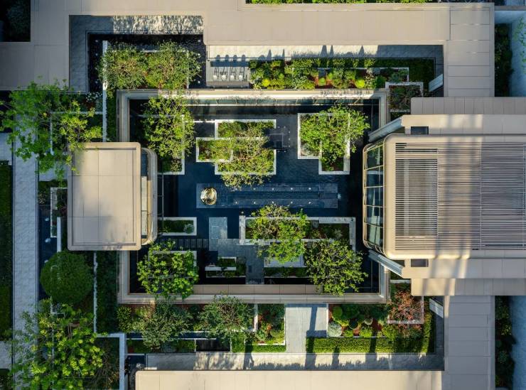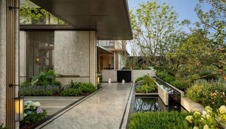 穿过会客厅,是以米兰森皮奥内公园与三亚艾迪逊为灵感打造的水森庭院。黑金沙铺就大尺度水院,点缀范思哲黑与潘多拉奢石,沉稳而高贵。亲水平台、中轴水景与6株错落有致的元宝枫,共同营造浮岛式度假体验。元宝枫四季变换:春红、夏荫、秋色、冬姿,寓意“家宅兴旺、财源广进”。枫叶形似元宝,更添富贵吉祥。