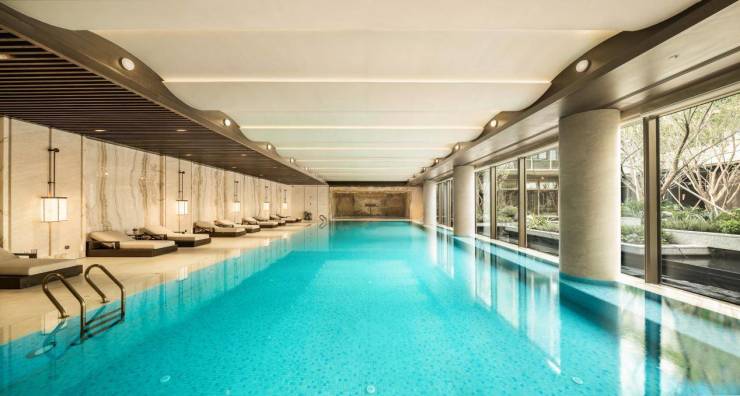 双生水殿设计成人&儿童泳池,池底数万片手工马赛克拼贴出深海蓝梦境,儿童戏水池与成人区通过波浪形吊顶隐藏灯带实现光影互动,池畔躺椅区便捷连接男女独立淋浴更衣室,从容使用之余,尊崇感拉满。