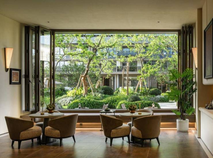 项目突破传统社区功能边界,将度假场景融入归家动线。超百米风雨连廊,挑高定制铝板搭配白玫瑰石材立柱,覆盖归家动线,罕见配置超越14万+标杆项目。红枫、香橼等绿植沿廊生长,将功能性转化为生活意趣。五感疗愈自然花园精选12株适应上海气候的乌桕,春夏季绿荫如盖,秋日红叶似火,“两季有果、三季有花、四季常青”的生态画卷,让都市人触摸自然脉搏。
