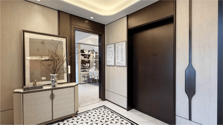 全明带飘窗的电梯厅,既为归家赋予了仪式感,又能改造成实用双玄关,将童车、存放快递、消杀换鞋等在入户门外完成,开门进家,减轻室内玄关的功能负担,更显开阔清爽。