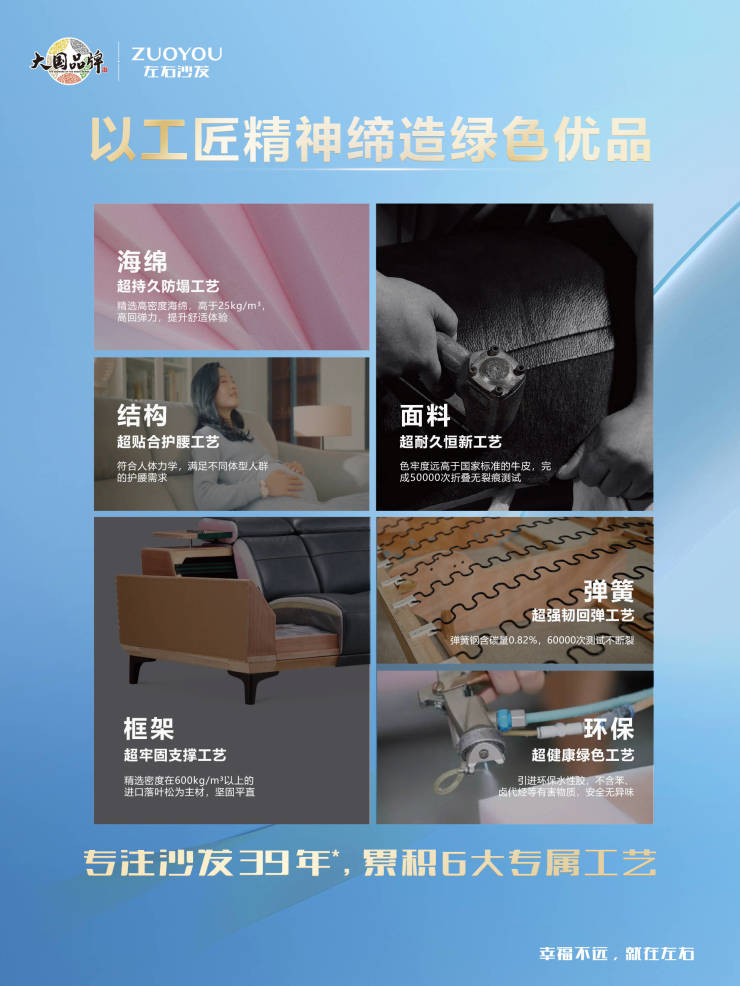 而这份对品质的极致追求,累积成左右沙发6大专属工艺,从超耐久恒新面料、超持久防塌海绵,到超牢固支撑框架、超强韧回弹弹簧,再到超贴合护腰结构与超健康绿色工艺,每一步都承载着“以工匠精神缔造绿色优品”的品牌承诺,也让“沙发专家”成为行业品质标杆。