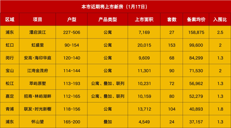 1月17日,网上房地产官网公示近期即将入市的新房名单,共计8个项目,全部是老盘加推,可供应618套新房,分布在浦东、虹口、闵行、宝山、嘉定、松江、青浦区域。