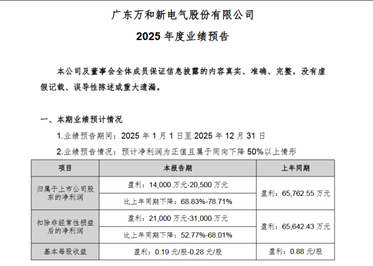 1月30日晚间,万和电气发布业绩预告,预计公司2025年度归母净利润为1.4亿元至2.05亿元,较上年同期的6.58亿元下降68.83%~78.71%。