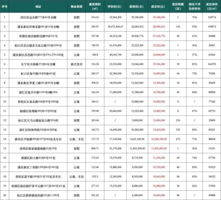 值得关注的是,在有评估价的房源中,最终成交价均低于评估价,形成显著的“性价比”优势。例如,青浦区一套评估价4451万元的别墅,以2713万元成交,相当于评估价的61折。另有三套房源低于评估价6折,接近半价“捡漏”。