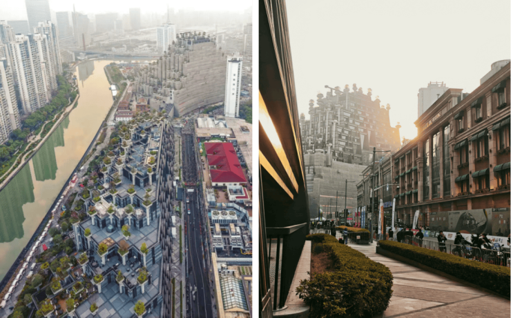 莫干山路既以山为名,也可以看到“山景”。商业休闲综合体“天安千树”如两座山峰耸立于此。一期建筑的南侧紧贴着莫干山路,外立面呈平直剖面,仰视恰似峭壁悬崖,壁上镶嵌着一幅幅“艺术巨幕墙”。二期建筑尚在建设中,但已逐渐脱下脚手架“外衣”,显露峥嵘。再来到建筑的北立面,这里面朝苏州河,又是另一番风景。整组建筑呈斜坡状,与水面组合成一幅山水画。再细看,“山”是由一根根高低错落的白色立柱撑起,柱顶绽开呈盆状,冒出一棵棵树木。待项目二期竣工,树木总数将达到上千棵,“千树”之名由此得来。