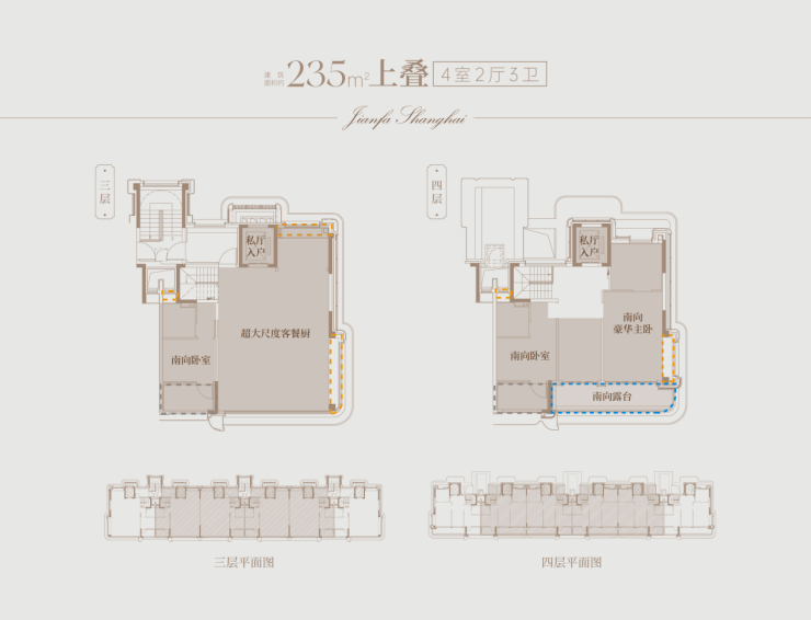 本次建发海宸推出的34#的上叠,以建面约235㎡的空间尺度,实现终极改善之选。北向首层私享建面约25㎡的入户花园,结合独门独户设计及室内私家电梯,从归家第一步即彰显身份感与私密性。室内布局同样出色,四间卧室均朝南,实现全明采光,主卧打造为豪华套房,不仅配置完备,更外接南向超大露台,于此观星、品茗或小憩,私享一方宁静天空。