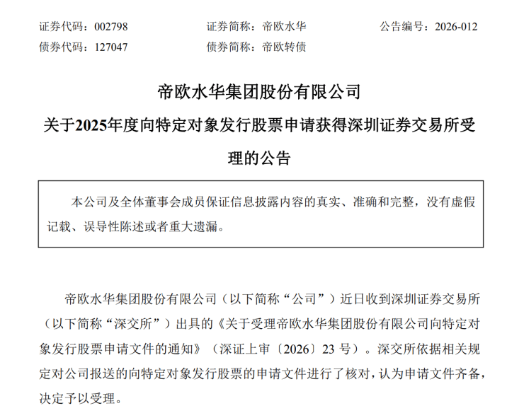 2月6日,深圳证券交易所官网披露消息显示,帝欧水华集团股份有限公司(证券简称:帝欧水华,证券代码:002798.SZ)2025年度向特定对象发行A股股票募集说明书(申报稿)已被正式受理。