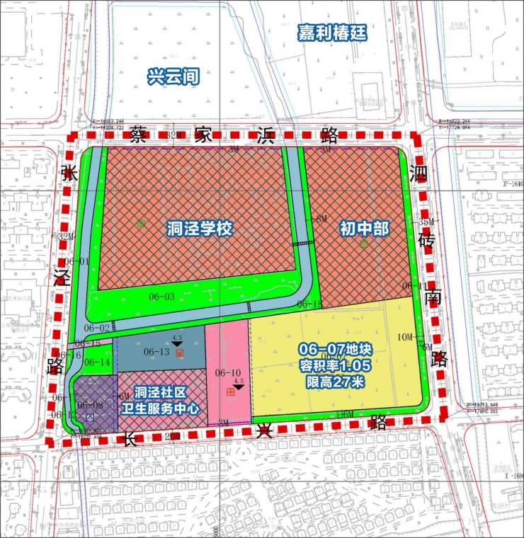 在现状洞泾社区卫生服务中心(06-09地块)北部规划新增一处医疗卫生用地,地块编号06-13,用地面积约6931平方米,容积率2.0,建筑高度控制在45米;