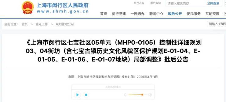 3月10日,《闵行区七宝社区05单元(MHP0-0105)控制性详细规划03、04街坊(含七宝古镇历史文化风貌区保护规划E-01-04、E-01-05、E-01-06、E-01-07地块)局部调整》正式获批。