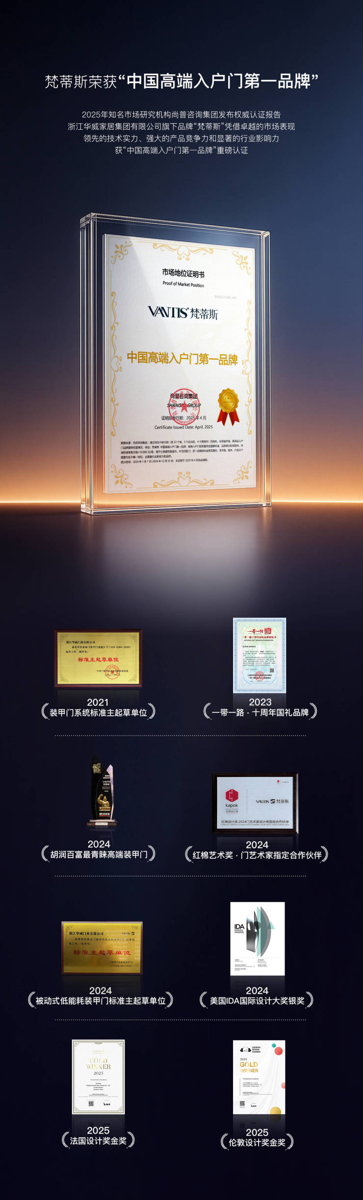 作为中国装甲门系统标准主起草单位、行业内首家通过德国PHI体系认证的装甲门企业,梵蒂斯以“承袭梵高对艺术的见解和极致追求,秉持极致完美的工艺品格,致力筑就品质经典恒久、艺术价值传世的入户臻品,制造更安全、智能、艺术的进户安全门,为万千家庭打造顶尖入户方案。”为初心,深耕高端入户门赛道,累计拥有314项国家专利,凭借硬核创新能力构建起艺术美学+实用功能深度融合的多元化产品矩阵,长期受到一线设计师群体与高端消费人群的青睐,是高端入户门设计领域公认的标杆品牌。