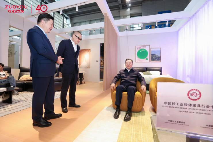展会当天,左右家居董事长黄华坤先生陪同中国轻工业联合会党委副书记/中华全国手工业合作总社副主任/世界家具联合会主席/亚洲家具联合会会长/中国家具协会理事长徐祥楠先生、世界家具联合会秘书长/亚洲家具联合会副会长兼秘书长/中国家具协会副理事长兼秘书长屠祺女士、深圳市家具行业协会主席侯克鹏先生、深圳家具行业协会副主席洪小惠女士参观左右沙发展位,左右沙发独具匠心的绿色环保展馆设计与可持续发展理念,赢得现场领导的高度赞誉与认可。