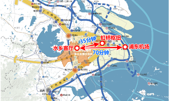 根据长三角一体化示范区综合交通专项规划,区域交通通达效率明确了定量目标:示范区城镇内部搭建15分钟社区出行圈,相邻城镇组团之间30分钟可达,水乡客厅至虹桥枢纽之间35分钟可达,水乡客厅至浦东机场之间70分钟可达。